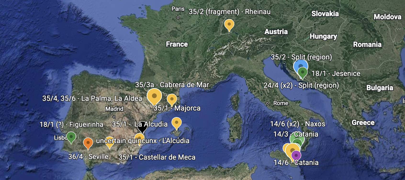 I was collecting bibliography yesterday and was impressed with the running theme of specimens found outside Italy. The Croatian finds don’t surprise me too much because of the Mazin hoard with its roman currency bar fragments (so called aes signatum, see #NotAllElephants). I’d tentatively relate the fragmentary nature of the find in Switzerland to a similar phenomenon. Martínez Chico is right to emphasize the military camp finds at La Palma from the Prow series and events of 2nd Punic War to explain eastern Iberian find patterns and I’d transfer that logic to all the yellow dots in Sicily. The green dots (series 14 and 18) on the Sicilian eastern coast remind me of the patterns noted by Jaia and Molinari 2011, i.e. the association of these early series with the fortification of the Tyrrhenian seacoast line.