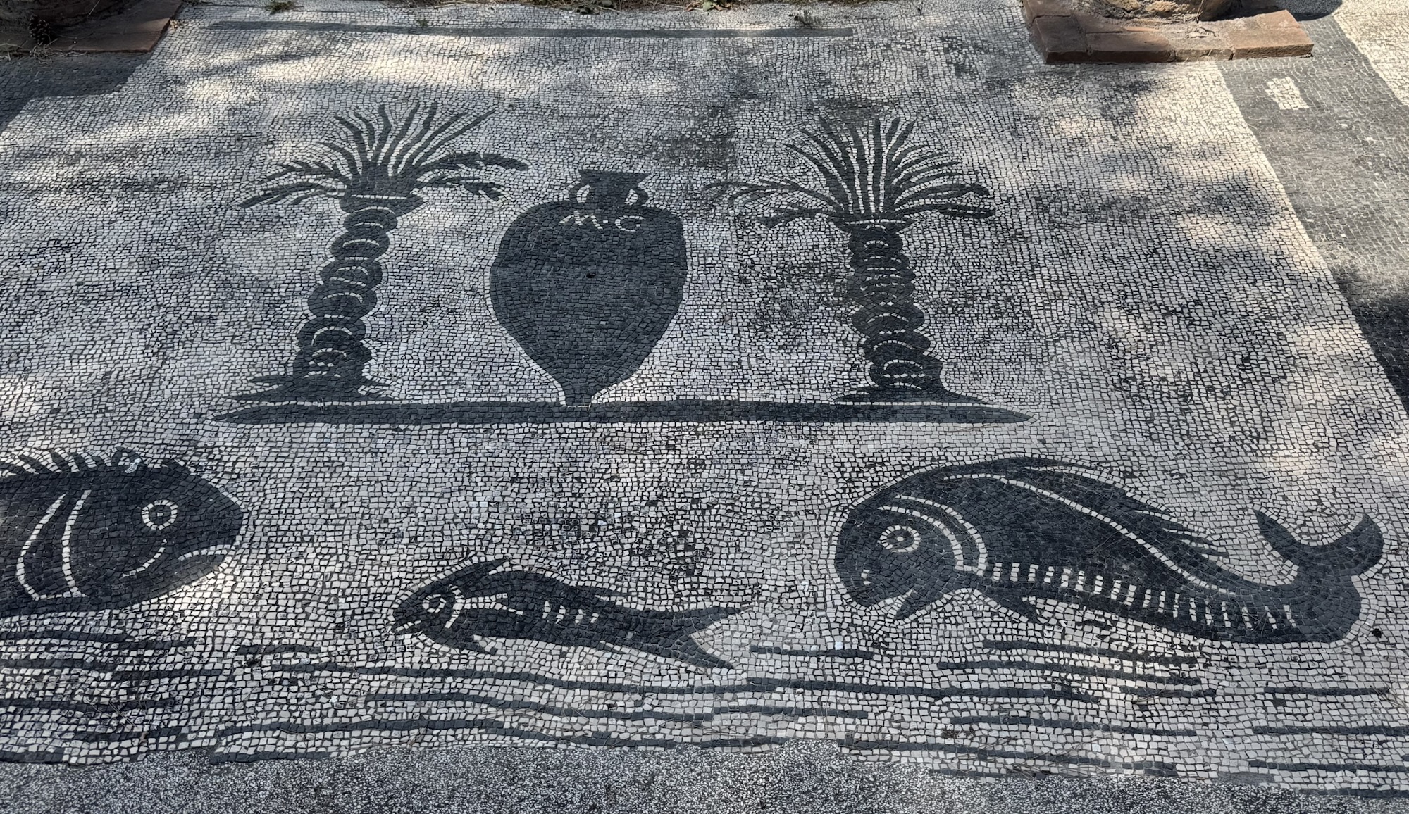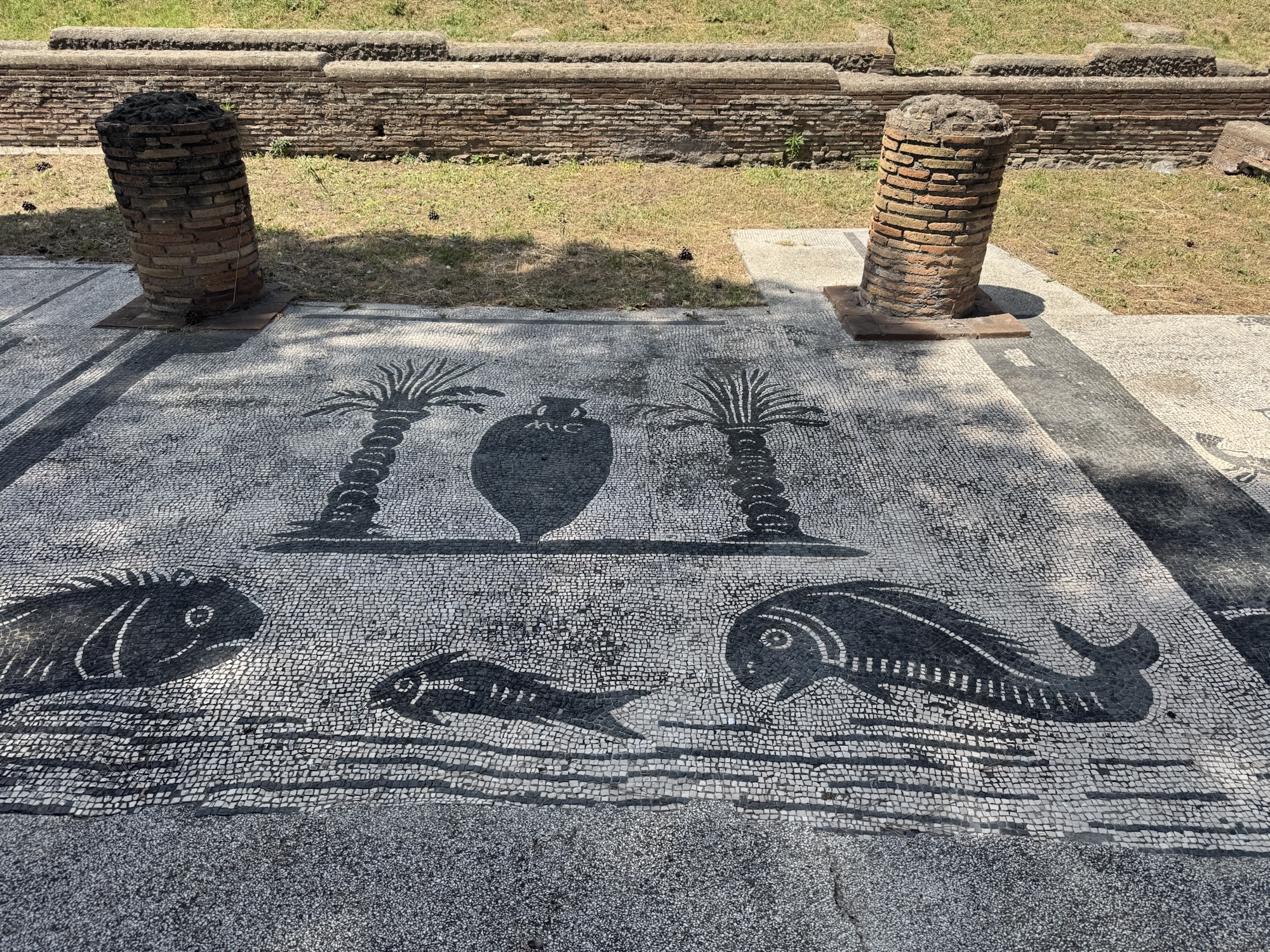 Something about the shape of the palm trees reminded me so strongly of date palms versus other species, I was so surprised not to see any bunches hanging from them. The fish are very fishy with clear spikes and gills and belly scales, not dolphin like. I wondered if they might evoke garum production.