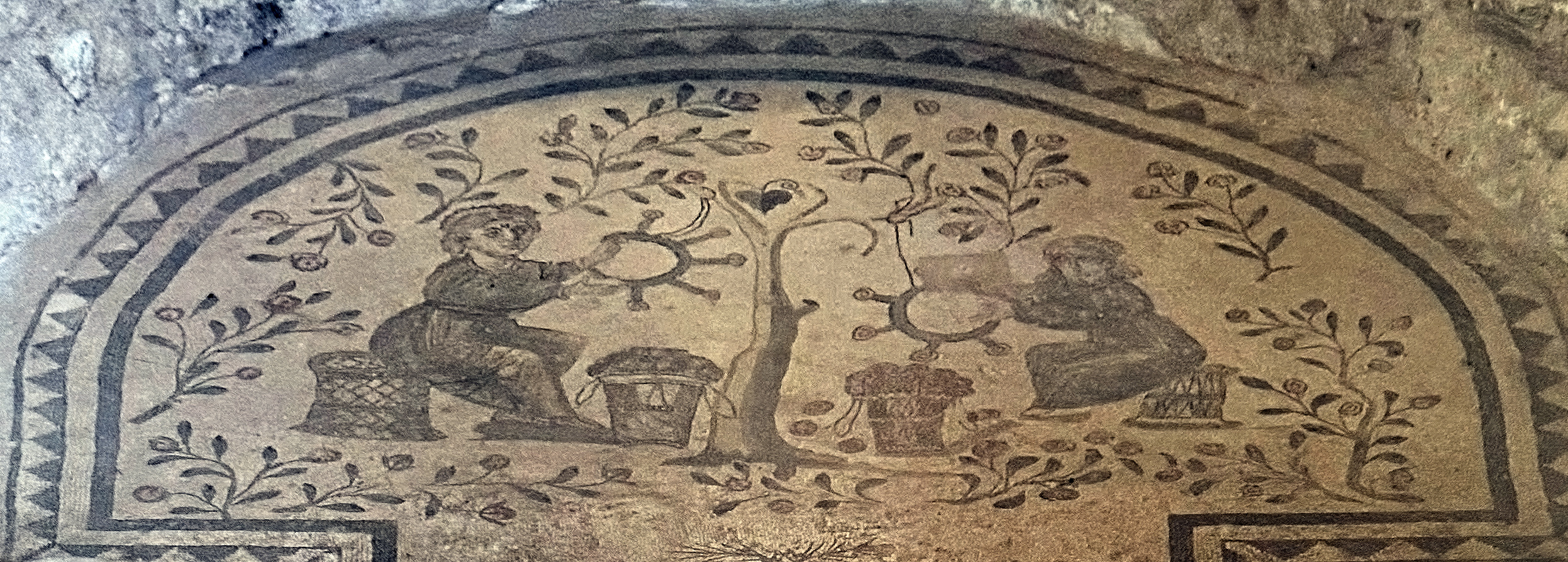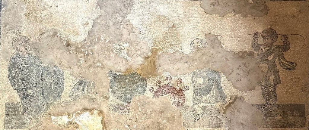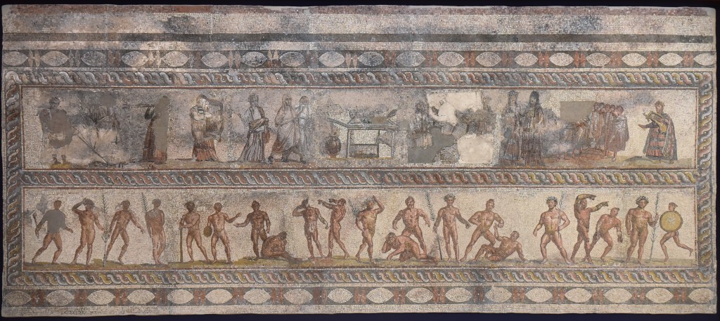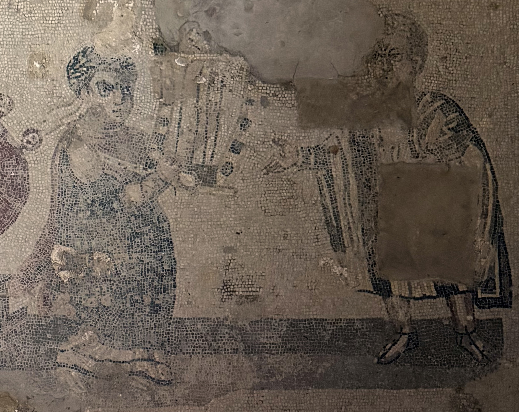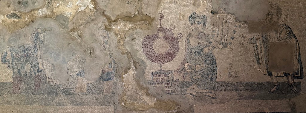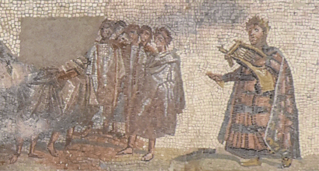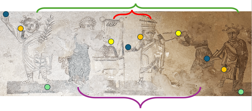 My final thought is after looking at the groupings on the Patras mosaic I’m more convinced that we are seeing different competitive categories: tragedy, comedy, instrumental and choral performance. I suspect there may be a fifth category I cannot yet name or recognize. It will come in time.
