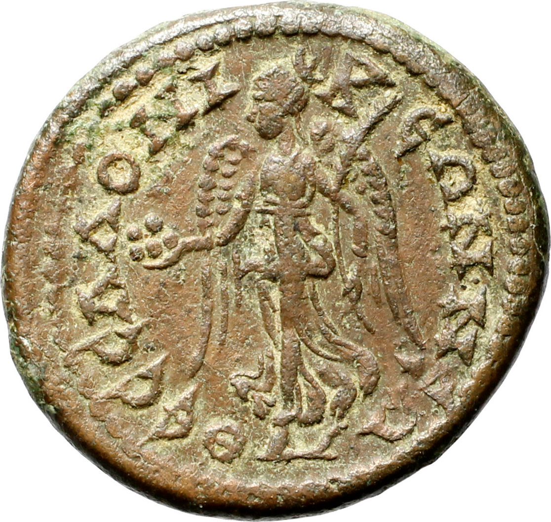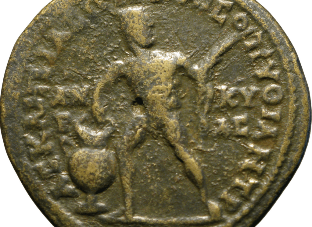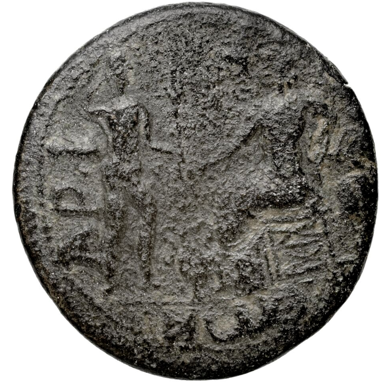 Coin of Ariassus under Gordian III: “Agon (?) seated left, dropping pebble into ballot urn and holding palm, facing nude athlete holding palm”
