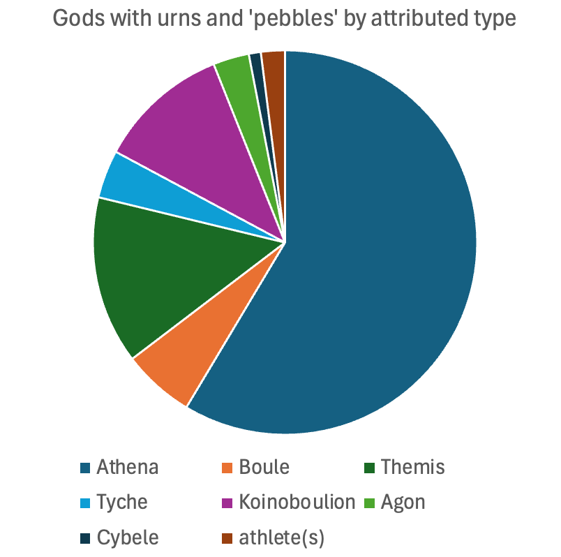 The figure with the so called pebble is invariably identified as divine and typically seated. The most common identification is Athena. But their are some interesting personifications esp. the Boule and Agon. However we should not be so certain in these catalogue identifications. All five types attributed to Agon, might equally be attributed to Tyche. The key attributes are a crown (mural? agonistic?) and a palm branch. Of the nine types identified as Boule only one is labeled as such. By contrast with or without pebble and urn when the personification Koinoboulion is identified on a coin she is invariability labeled as such.