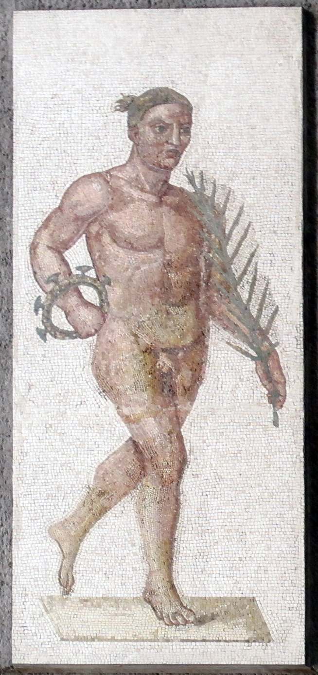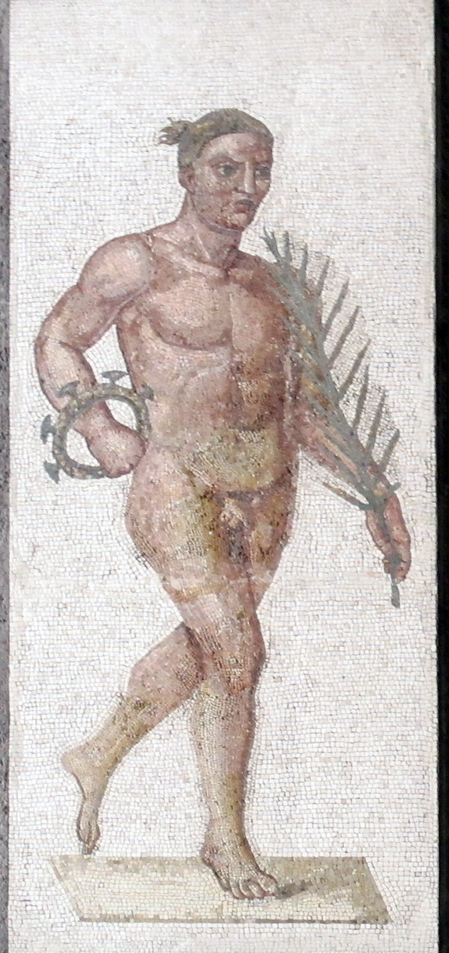 These athletes from the baths of Caracalla show the five pointed crowns and palms as contest prizes. The left figure also demonstrates an act of self crowning.