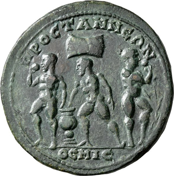 These athletes are not putting “pebbles” into the urn but drawing them out. Notice the two flanking Athletes are looking at the balls to see what place/order they have draw in the competition. The name of the god in whose honor the festival is to be held is in the exergue, Themis. It is no coincidence that so many of the deities identified as dropping pebbles into urns are identified as Themis! RPC VI, 5856 (temporary)