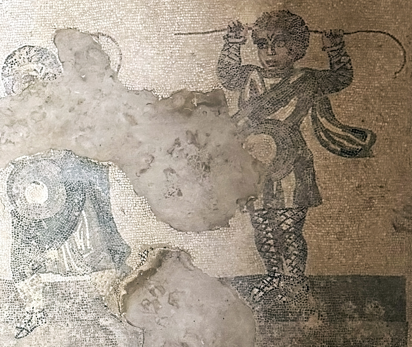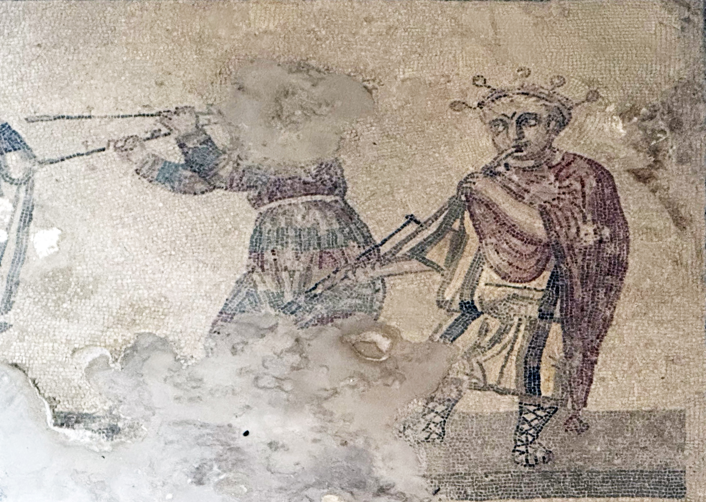 Perhaps the best parallel for these two figures are the figures from the Patras mosaic below. The far left figure seems to play a wind instrument with a similar elevated linear element near a female figure (right most in this cropping). The figure in the middle may be a judge. He could be equivalent to to figure (i) in this register.