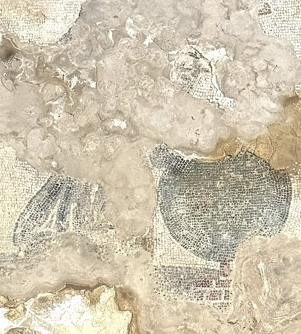 The division of these remains into three objects/figures can be supported by the traces in the middle of pyramidal base made of reddish rectilinear blocks as seen elsewhere in this same mosaic. Perhaps it held another amphora as in the register above, but a narrower one. If this is the case the two objects/figures on either side may be interacting with the urn, i.e. drawing lots. My difficulty with this interpretation is what seems to be bases or rectilinear elements under the more organic forms. Let us interrogate this for each figure.