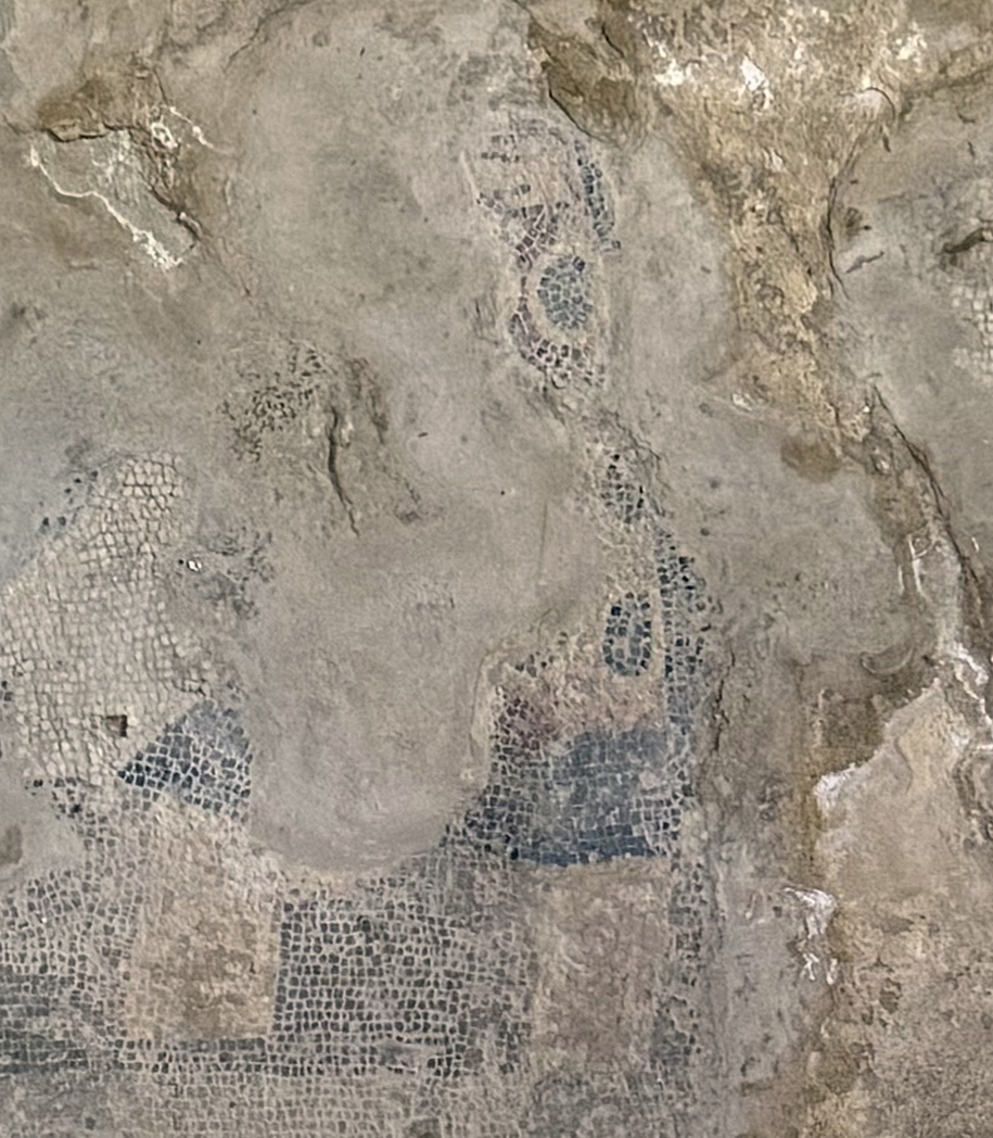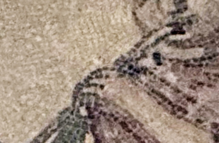 There is an S shaped curve of drapery on the left hand side. This is suggestive of cloth perhaps even a cloak on a human form. The irregular black lines on the white ground may indicate folds/pleats in an over garment. This could make the bottom band of a reddish color an undergarment perhaps with blocks of color red-grey-red-grey. I also wonder if there may have been some speculative or casual “restoration” work here that is fooling my eyes. Higher up on the figure(?), at about the the middle of the S shaped drapery there is a narrow horizontal band of alternating red and black tiles. Perhaps representing a belt? From the middle of this belt(?) there is a gentle sweeping line of tiles up to the right perhaps representing drapery over a shoulder. I see no trace of feet or arms.