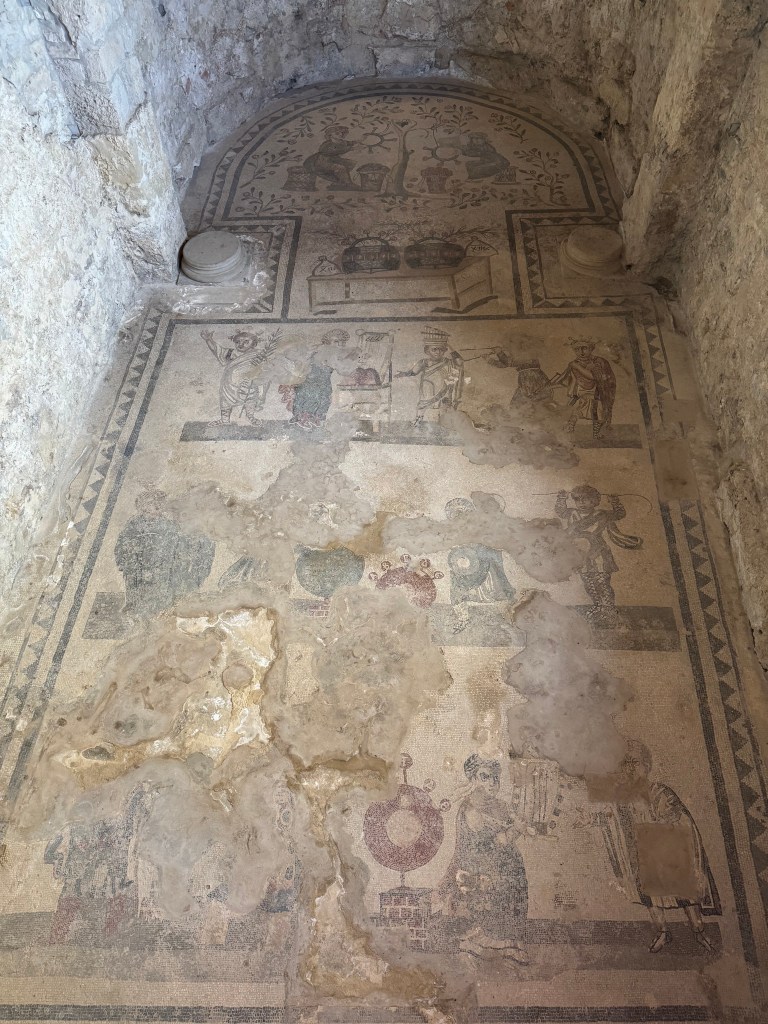 The mosaic is located at the star on this public domain site plan from wikimedia. This set of rooms is sometimes considered private family quarters. The dating of the mosaics are disputed but definitely no earlier than the tetrarchy and perhaps even mid to late 4th century. As I learn more I’m sure I’ll have more opinions.