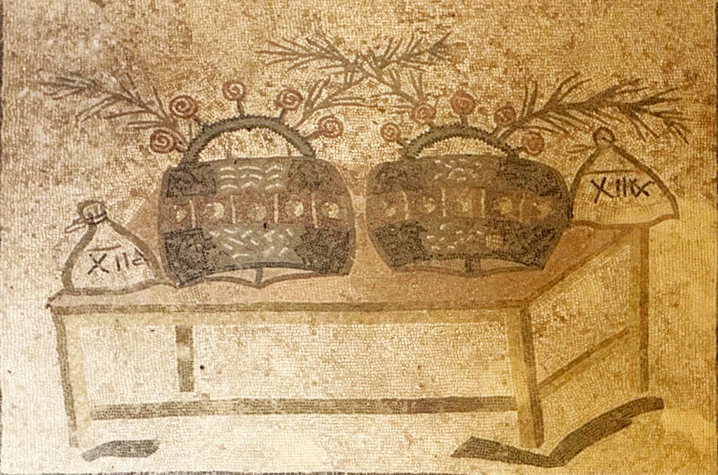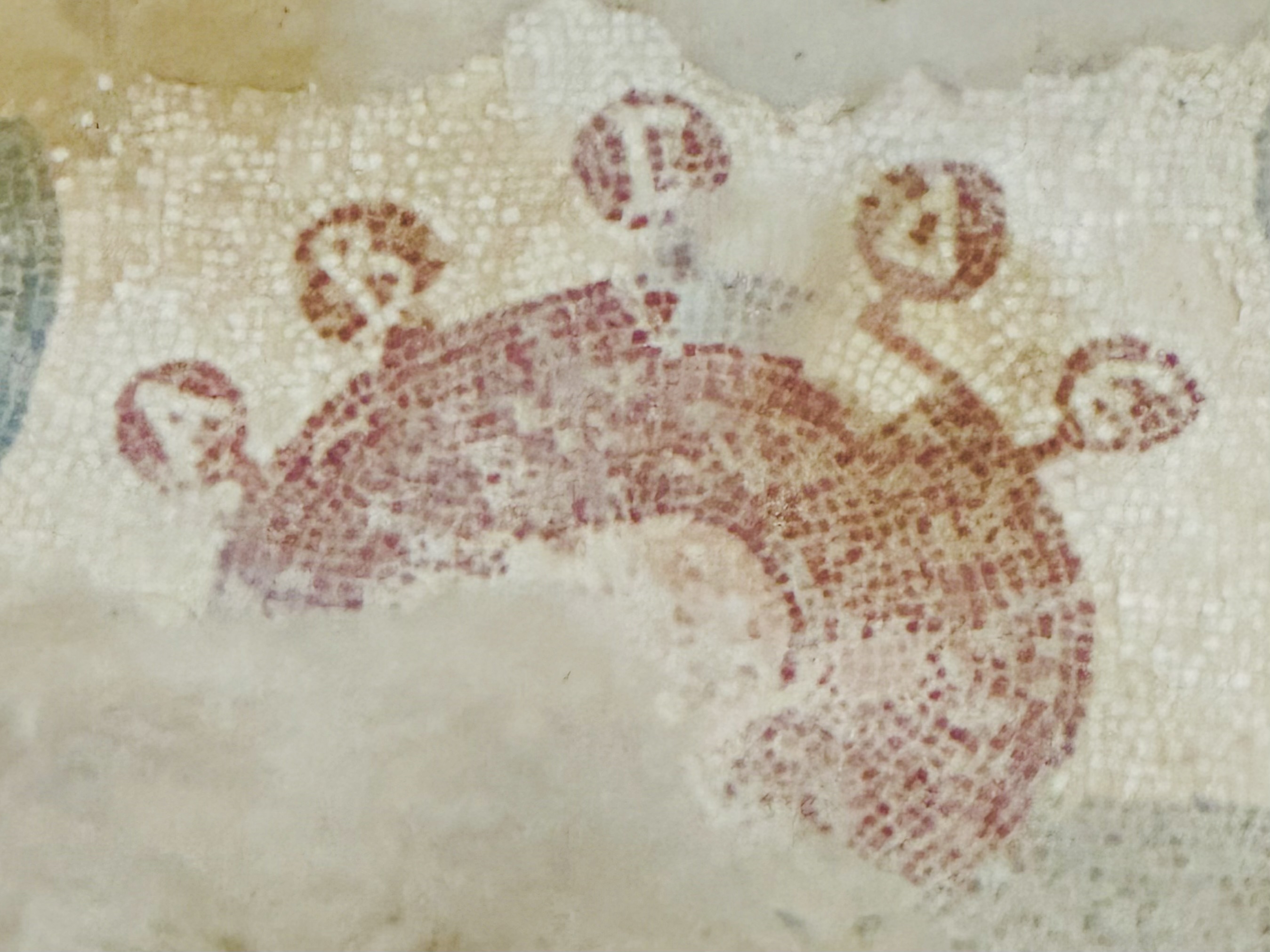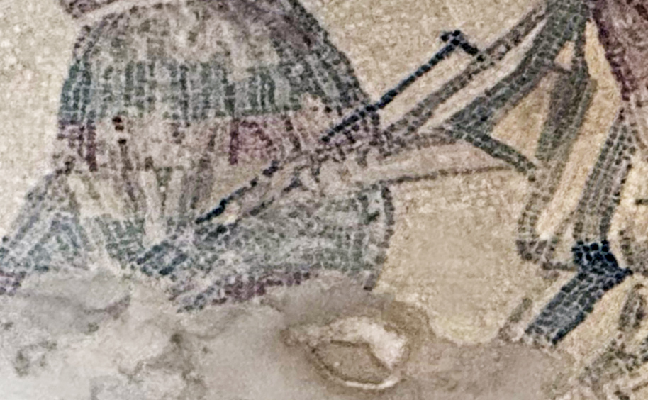 Object (v) is the other major oddity which sparked my deep interest (obsession?) with this mosaic since our visit last week to Piazza Armerina. A red ‘donut’ with five circles radiating out from the top half with the letters A, B, Γ, Δ, E. I failed to get a copy of the label on the site, but I’m positive it suggested these were musical notes and possibly an instrument. This cannot be right. Musical notation worked on different principles and this resembles no known instrument.