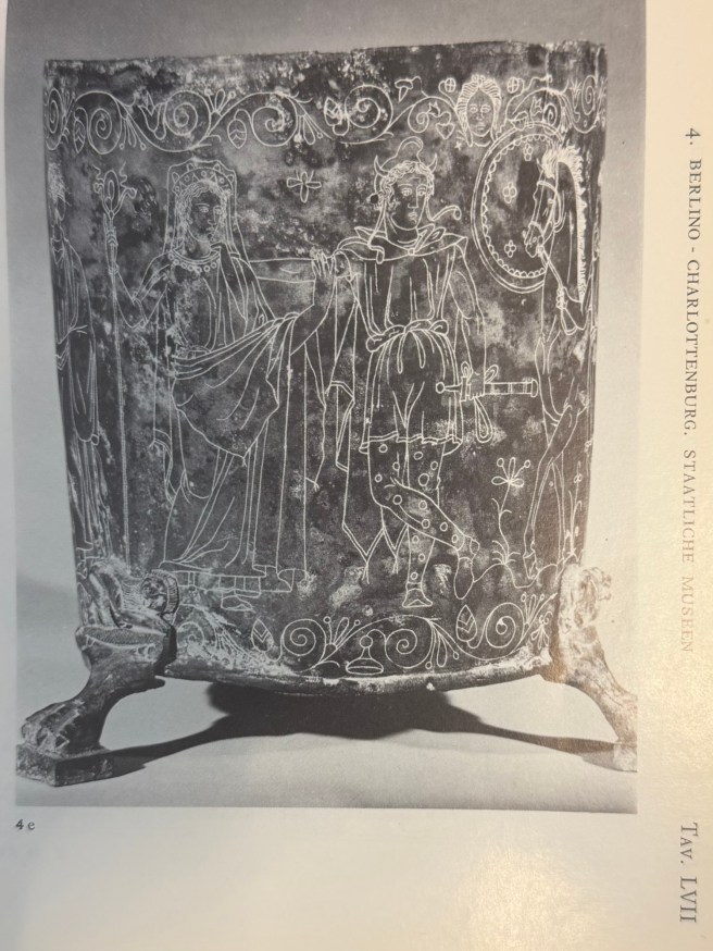 That said, I do think the Phrygian cap complicates things. Having wasted/enjoyed a great deal of time with LIMC to consider if such a cap could be Dionysiac, I have to say probably not. There is this vase(?) in Munich (I so want a better image) that is Fulfluns 83. I cannot figure out for the life of me why anyone made this ID, except unless they see etruscan letters in the squiggles that I cannot quite make out 𐌐𐌖𐌘𐌋𐌖𐌍𐌔. Dionysus does sometimes have thyrsus spear in gigantopicay scenes but I can’t see that here either.