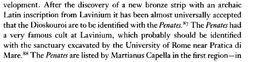His argument is complex and he quickly shifts into aligning the Dioscuri as the Penates, an issue we’ve discussed before. His resolution doesn’t seem immediately obvious to me, as it seems to require us to believe the name of the gods was broken in the middle and written on two lines and does not explain the full text. It comes down to the two inscriptions sharing at most a three letter sequence in common.