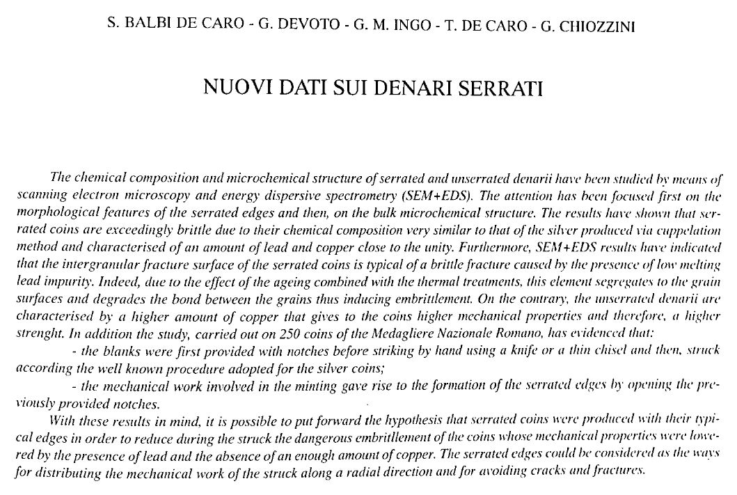 In inexplicably they use E. R. CALEY, Analysis of Ancient Metals, Pergamon Press, Oxford 1964 for comparative data instead of Walker, D. R. (1980) The silver content of the Roman Republican coinage’, in D.M. Metcalf, W.M. Oddy (edd.) Metallurgy in numismatics, 1 (London), 55-72. Another missed opportunity.
