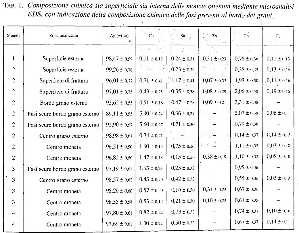 The abstract is a little misleading. 250 coins were not looked at with SEM+EDS only 5 got the full treatment. The 250 is the number examined with an ‘ordinary’ (?) microscope. Here’s the data on the five that got the works:
