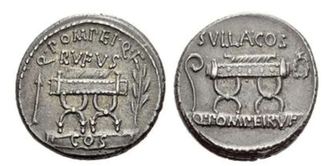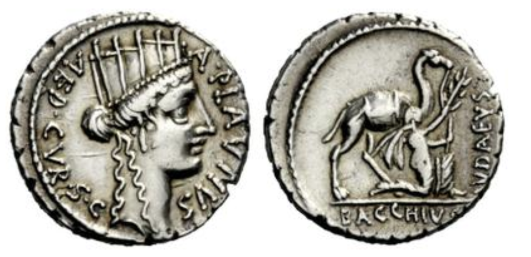 So with comparative iconography really struggling to offer any help, how do we resolve the type of species and its symbolism on the Caesar coin? We could rely on a semantic bleeding over from the caduceus. Or we could use a bit of deductive reasoning. Laurels connoting victory are usually laurel wreaths not branches. Laurel branches are more often associated with the cult of Apollo and as there is no good reason to bring the cult of Apollo in the mean being the Caesar coin, we might conclude that an olive branch is more likely…