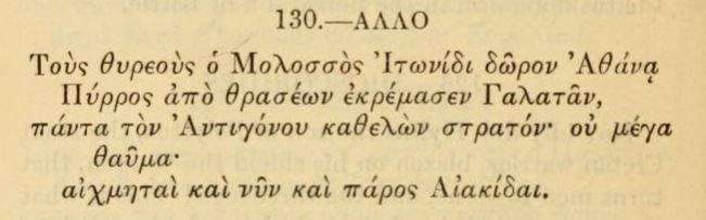 What does Pyrrhus have to do with Thessaly? Well it was his next stop after Italy. So Pausanias, and with references at Plutarch, and Diodorus, and the dedicatory inscription he set up is in the Greek Anthology attributed to Leonidas (6.130). Some discussion of his memorable dedication and his choice of sanctuary can be found in Graninger’s Cult and Koinon in Hellenistic Thessaly. The dedicatory inscription in fact emphasizes his decent from Achilles: