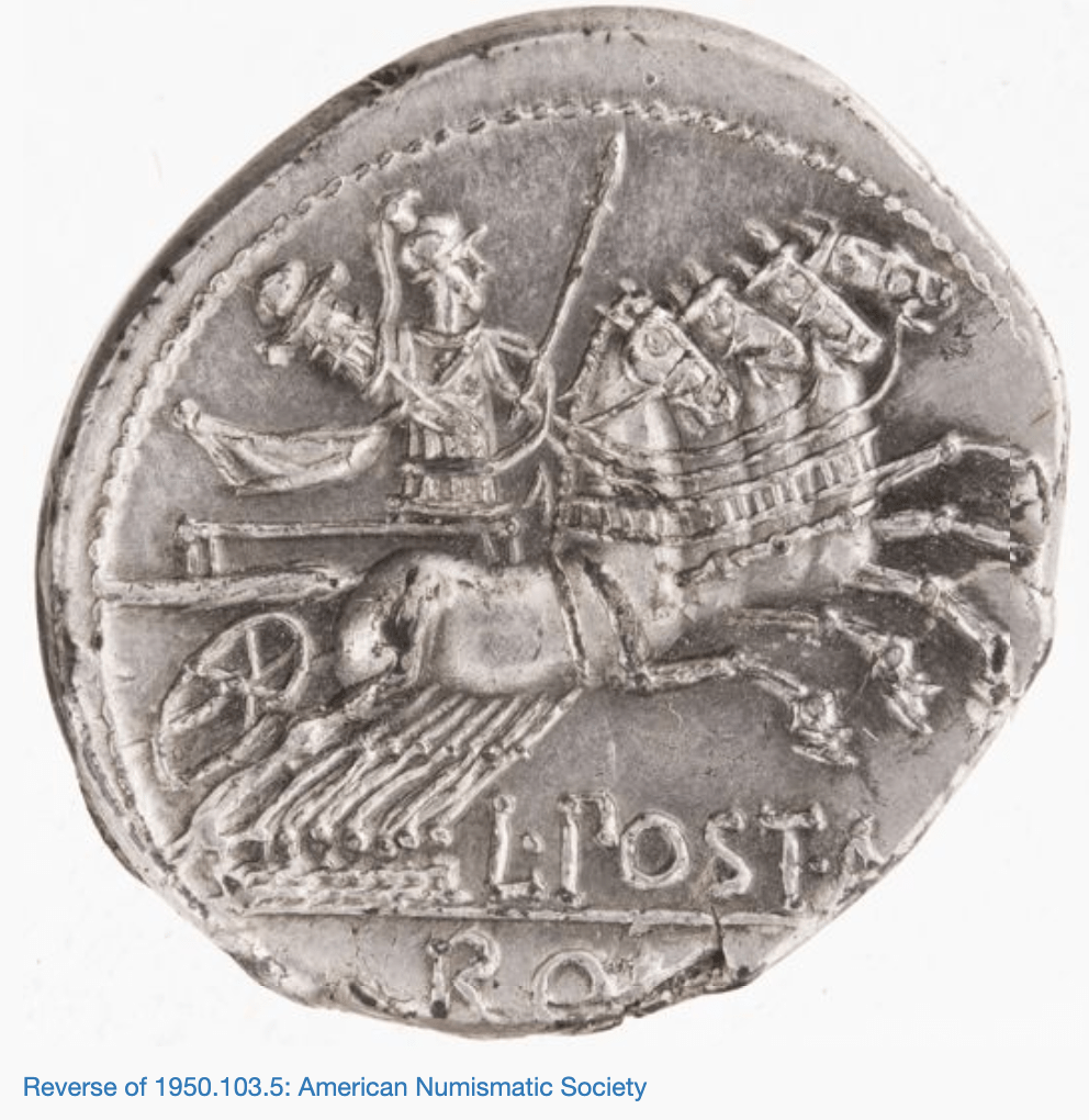 134 BCE, RRC 244/1 Mars in ‘fast’ quadriga holding trophy