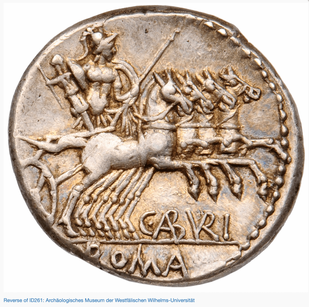 The three-quarters profile chariot is unusual as is the lack of indication of motion in the horses, neither slow, nor fast, just still. The stillness and the palm branch and the laurel wreath are the best arguments for seeing this as triumphal.